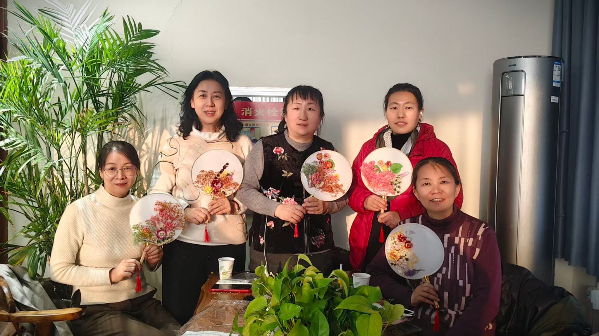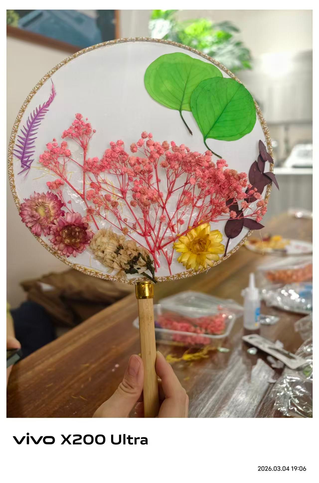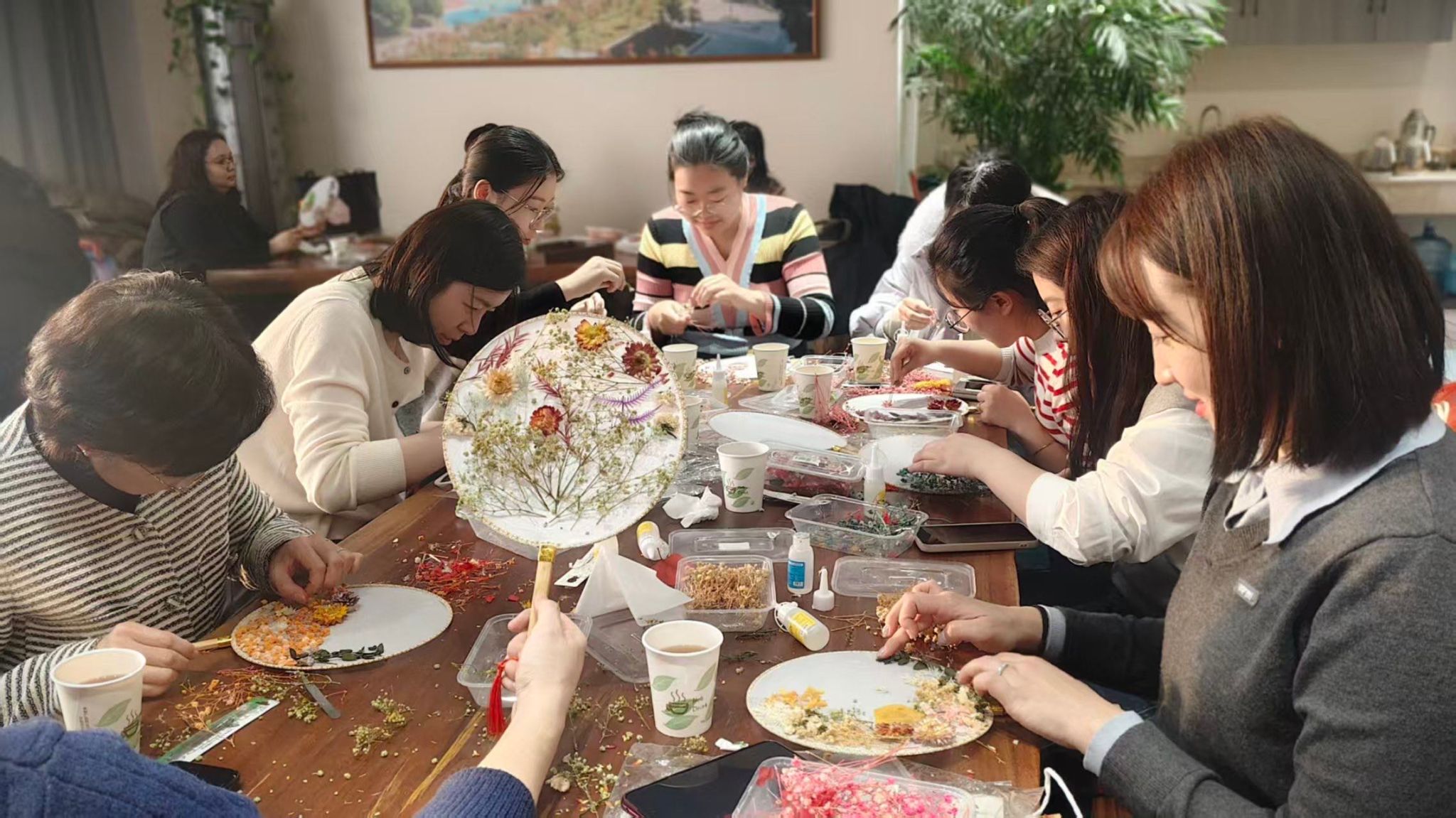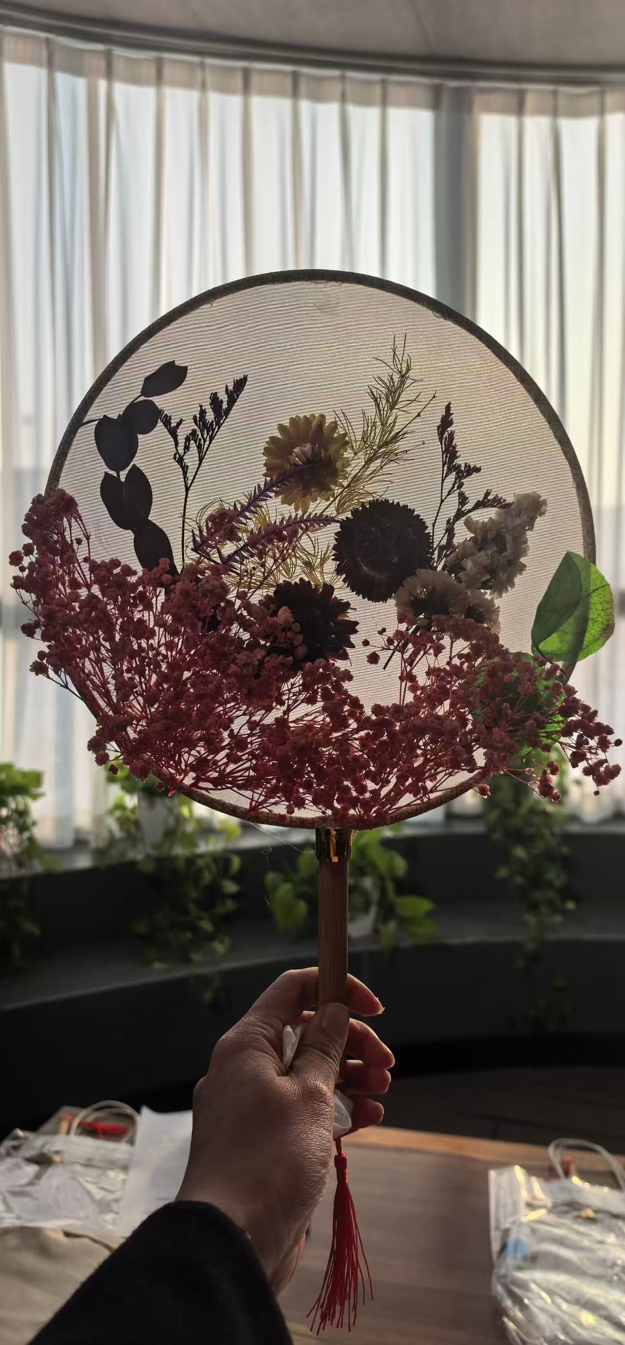 大家庭、充满活力的青年女教师,大家齐聚一堂,气氛温馨而热烈。在了解了团扇蕴含的深厚文化底蕴和基本的制作技巧后,老师们纷纷化身“巧手匠人”,发挥自己的创意和审美情趣。她们小心翼翼地构图、搭配、粘贴,将一朵朵干花、一片片绿叶在素白的扇面上精心布局,原本素雅的团扇在老师们的巧手下渐渐变得“花团锦簇”、独具匠心。