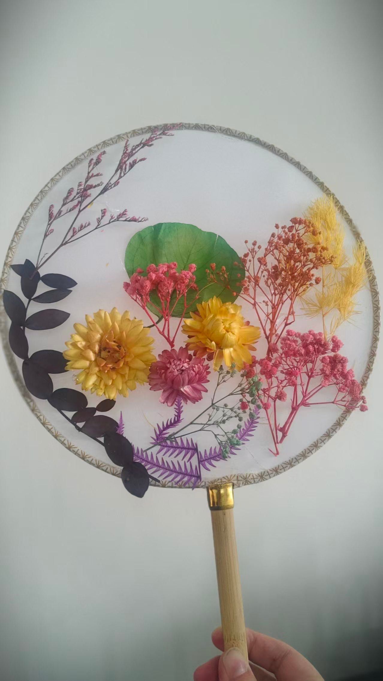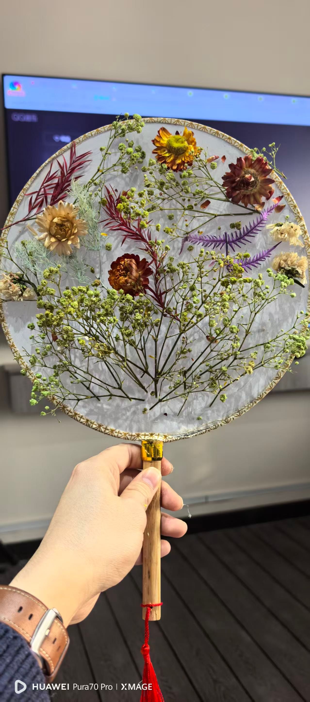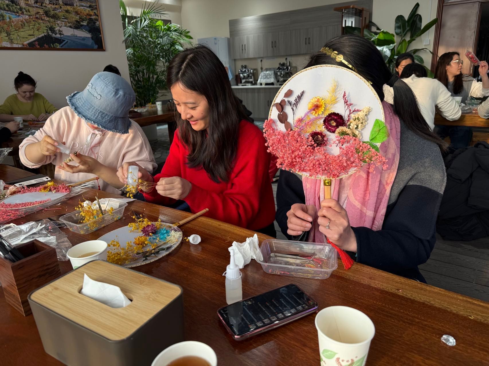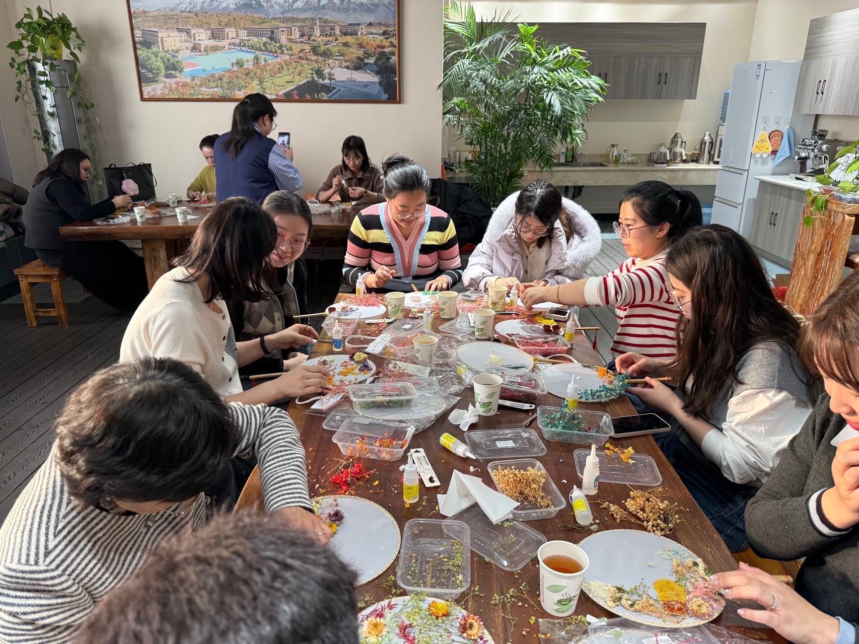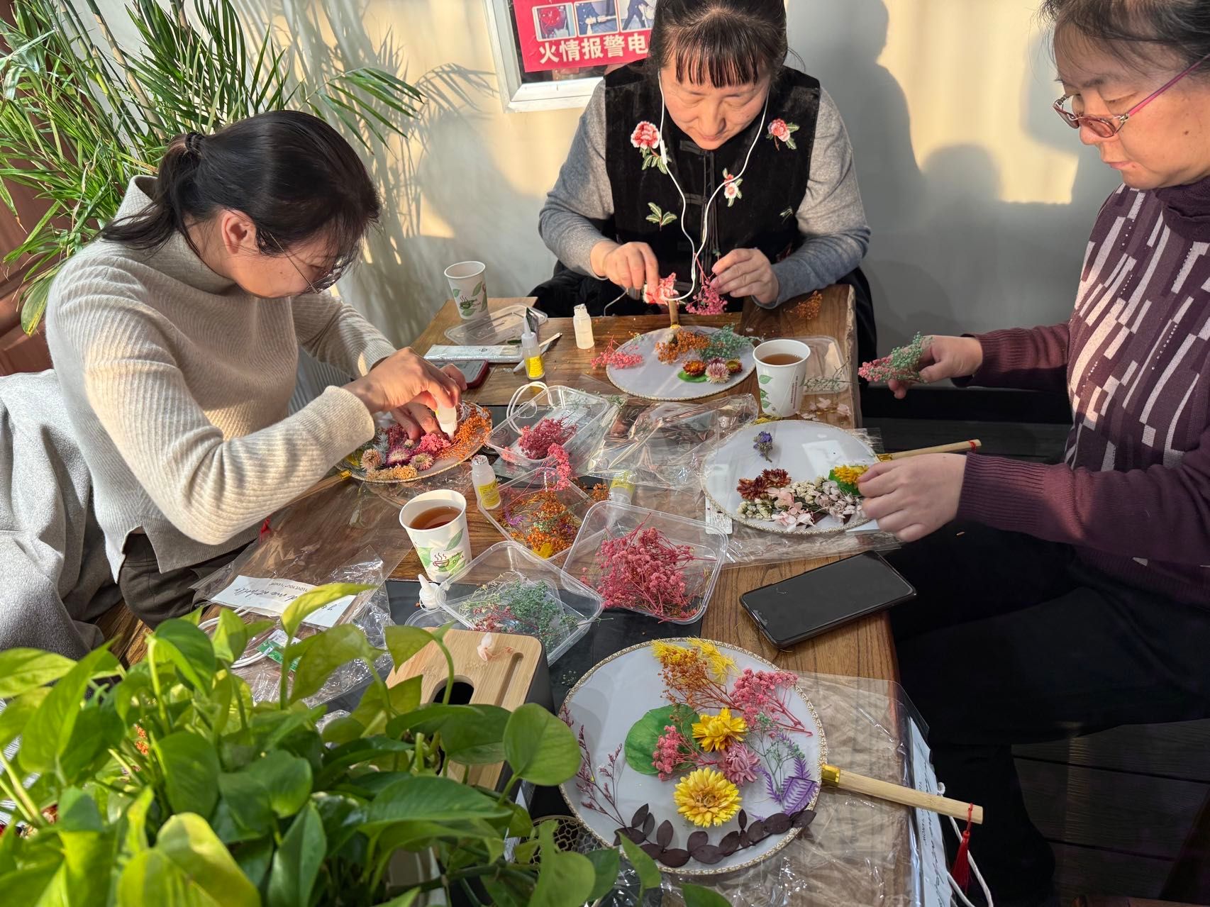 大家庭、充满活力的青年女教师,大家齐聚一堂,气氛温馨而热烈。在了解了团扇蕴含的深厚文化底蕴和基本的制作技巧后,老师们纷纷化身“巧手匠人”,发挥自己的创意和审美情趣。她们小心翼翼地构图、搭配、粘贴,将一朵朵干花、一片片绿叶在素白的扇面上精心布局,原本素雅的团扇在老师们的巧手下渐渐变得“花团锦簇”、独具匠心。