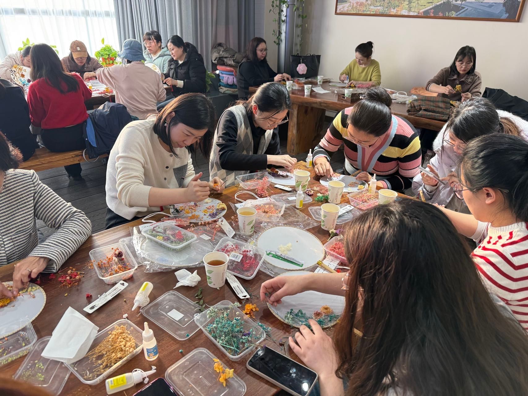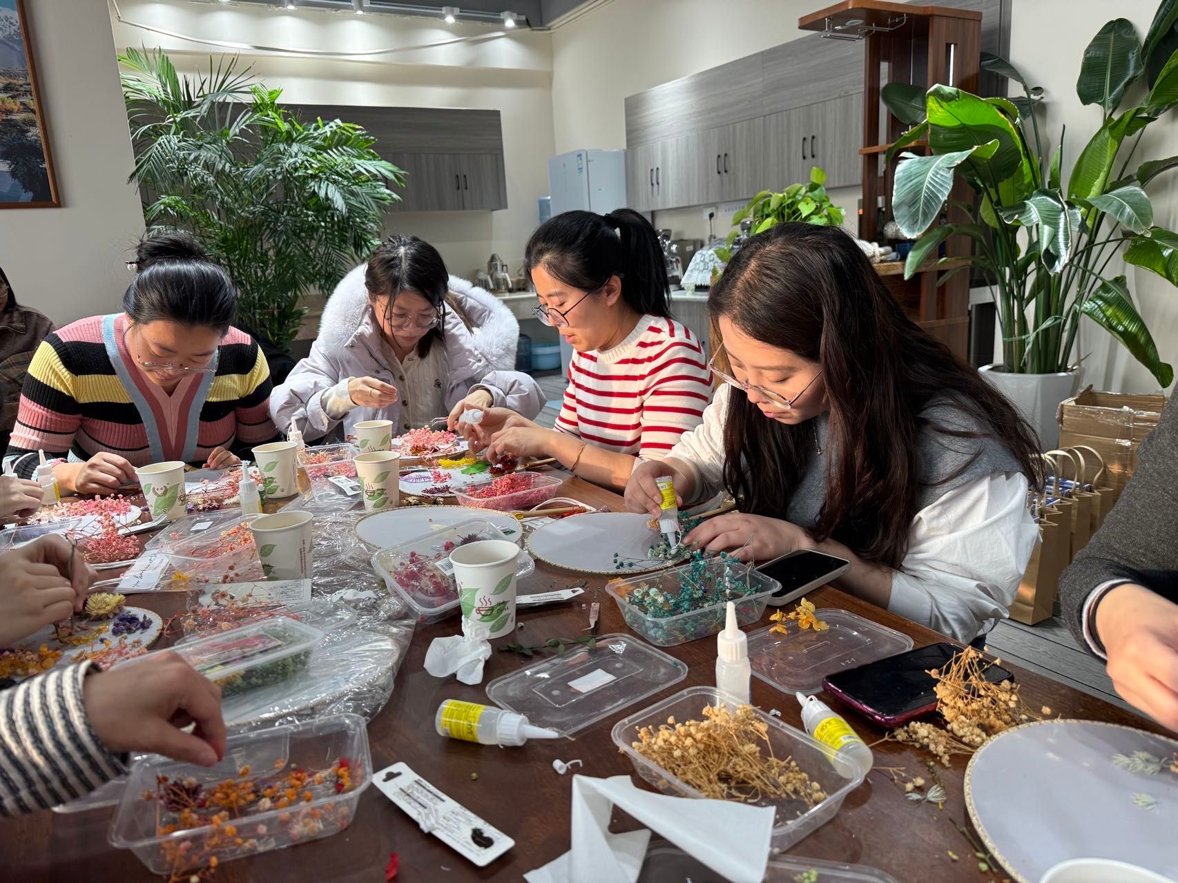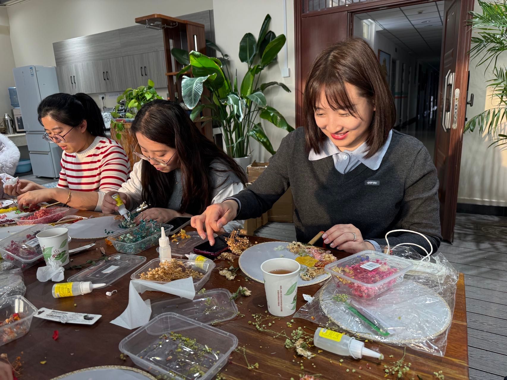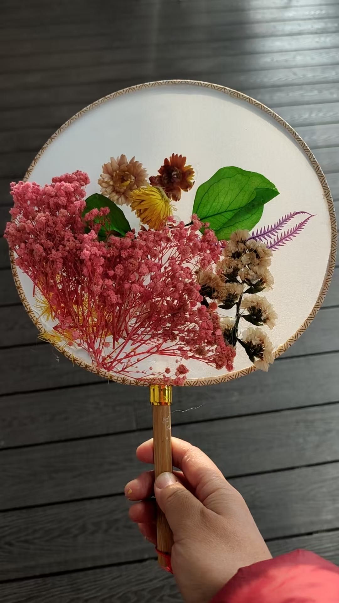 大家庭、充满活力的青年女教师,大家齐聚一堂,气氛温馨而热烈。在了解了团扇蕴含的深厚文化底蕴和基本的制作技巧后,老师们纷纷化身“巧手匠人”,发挥自己的创意和审美情趣。她们小心翼翼地构图、搭配、粘贴,将一朵朵干花、一片片绿叶在素白的扇面上精心布局,原本素雅的团扇在老师们的巧手下渐渐变得“花团锦簇”、独具匠心。